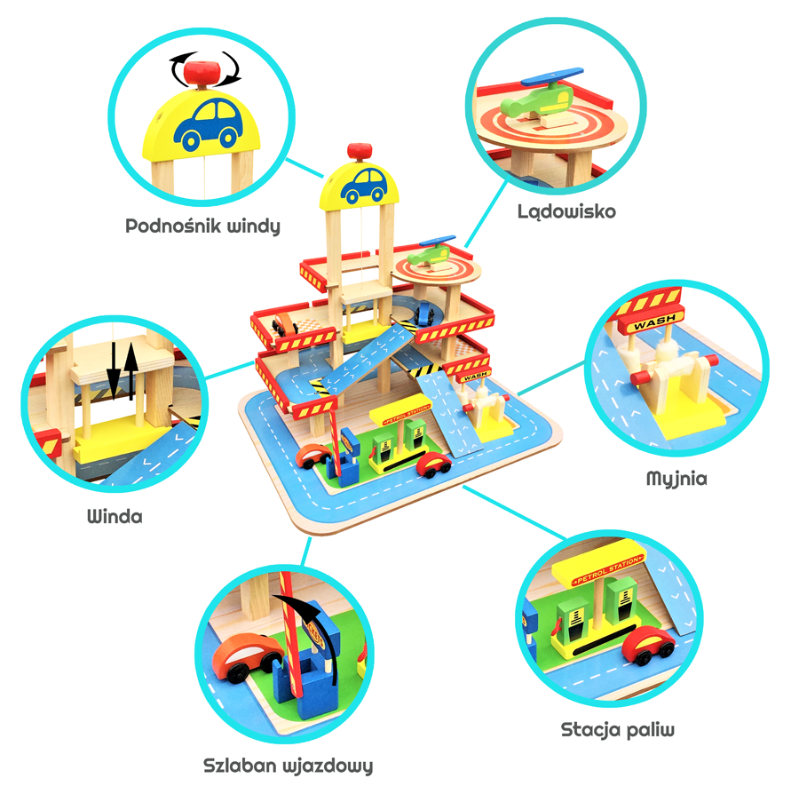 Śliczny drewniany garaż - parking dla dzieci z akcesoriami
