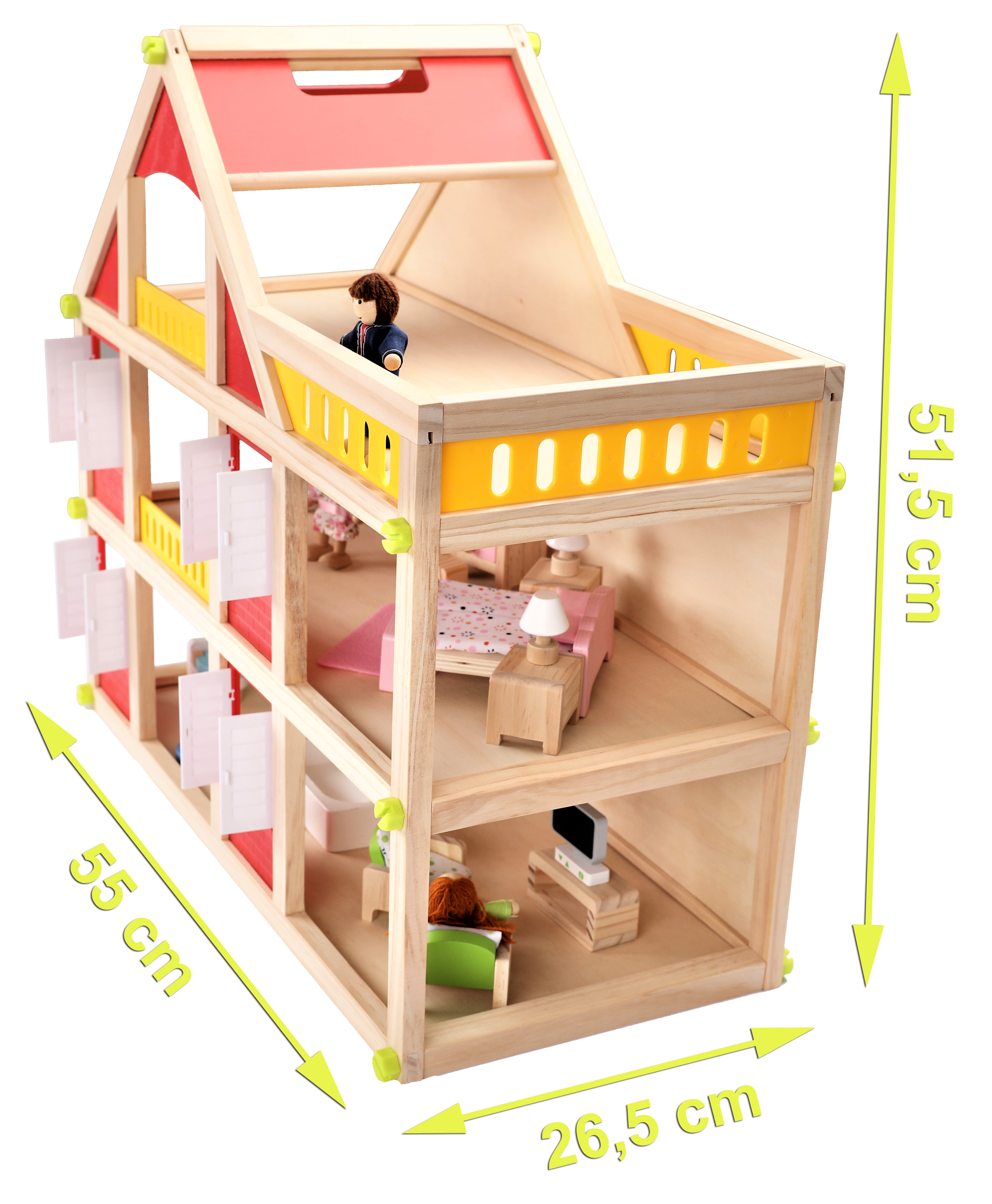 Duża ilość ruchomych mebelków, drewniane laleczki, wspaniała kolorystyka - oto wymarzony dom dla najbardziej wymagających lalek!