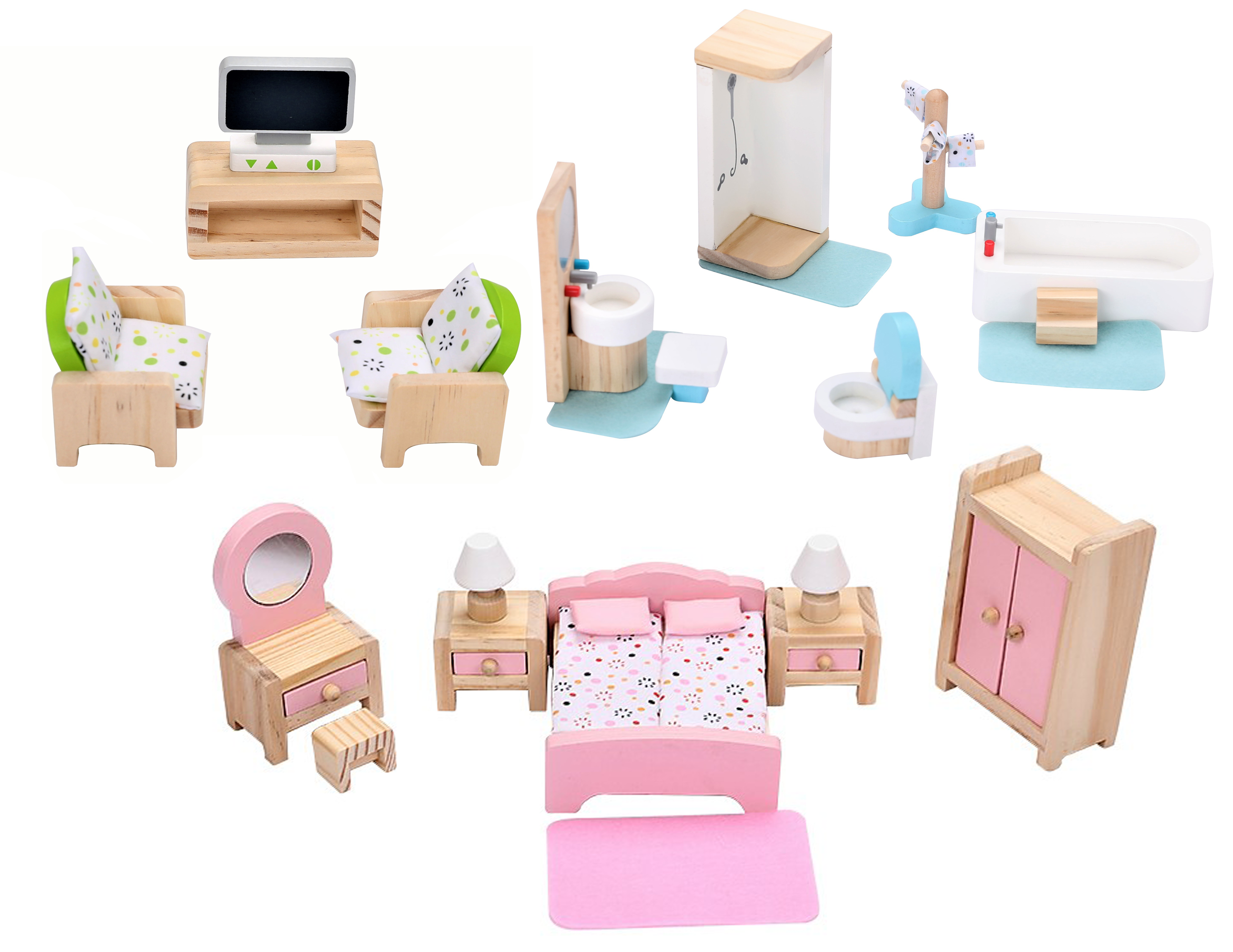- Miękkie dodatki: 4 dywaniki, 2 kołdry z poduszkami, 2 poduchy na fotele, 3 ręczniczki